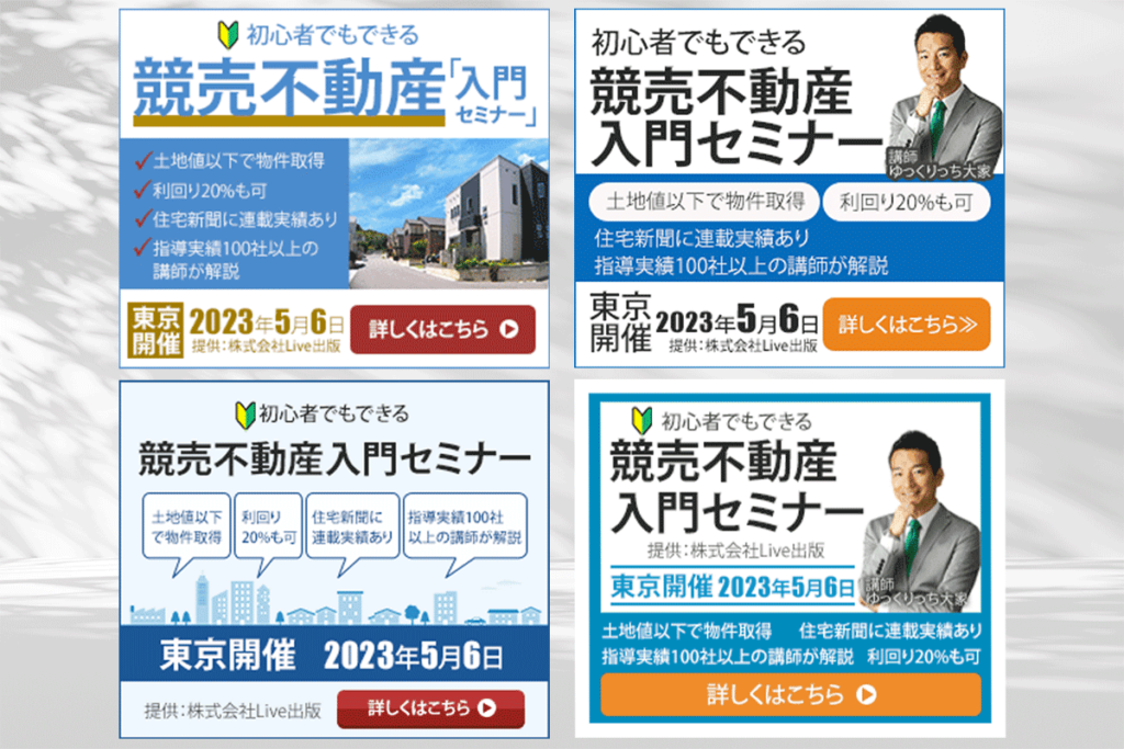 バナー 競売不動産入門セミナー 投稿日: 2024年1月20日2025年11月4日 投稿者: tsukina.0925@gmail.com 競売不動産入門セミナーバナーデザイン 使用ツール:Photoshop 担当:デザイン 制作時間:各1h イメージカラー:青、オレンジ(黄)、赤 第一印象:清潔感、存在感 目的 ・競売不動産入門セミナーの告知 ・セミナー申し込みへの誘導 ターゲット ・競売不動産に興味のある男女 デザインの観点 競売不動産セミナーのランディングページに誘導するためのバナーです。 同じ文言でもバリエーション豊かにデザインすることができます。
