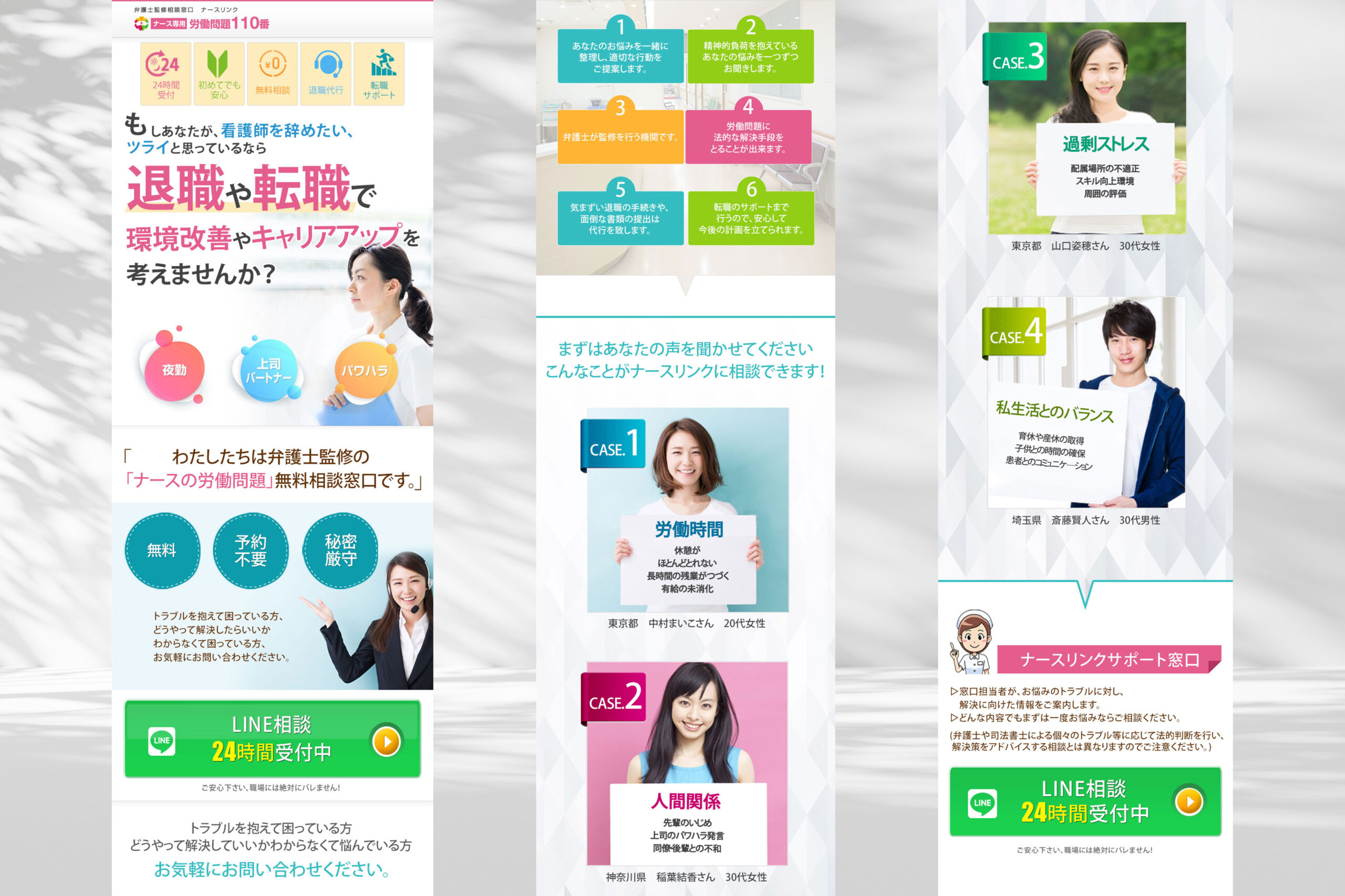 LP制作 ナースリンクサポート窓口 投稿日: 2024年1月22日2025年11月4日 投稿者: tsukina.0925@gmail.com ナースリンクサポート窓口のLPデザイン 使用ツール:Photoshop 担当:デザイン 制作期間:約10日 第一印象:誠実さ 目的 ・LINE無料相談窓口への誘導 ターゲット ・労働に関するトラブルに悩む看護師 デザインの観点 スマートフォンで見た時にも内容が分かりやすく伝わるようレイアウトを工夫しました。 PCだけでなくモバイルデザインに特化したデザインも可能です。