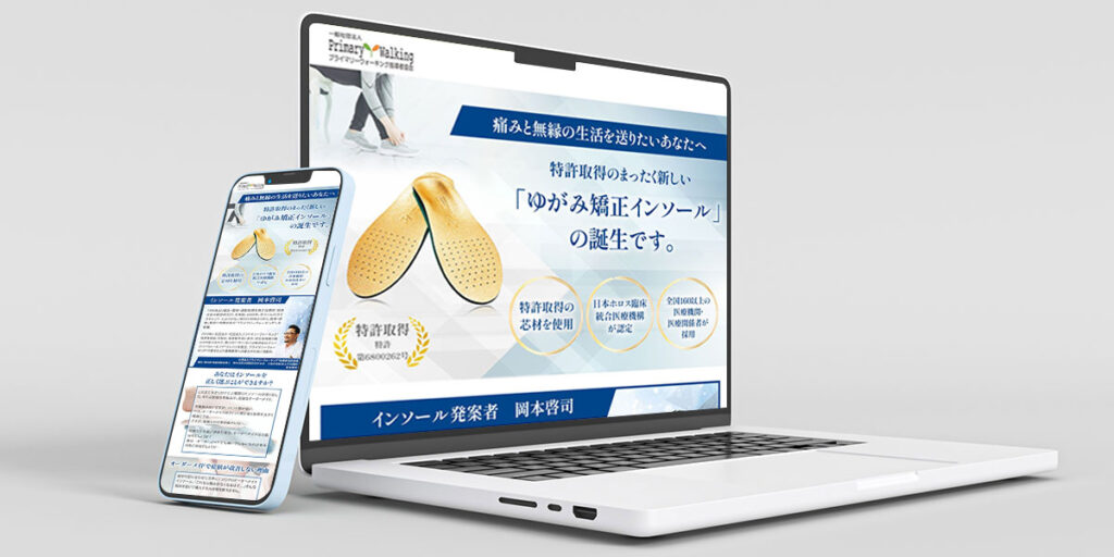 LP制作 プライマリーウォーキングインソール 投稿日: 2024年3月27日2025年11月4日 投稿者: tsukina.0925@gmail.com プライマリーウォーキングインソールLPデザイン 使用ツール:Photoshop、WordPress 担当:デザイン 制作期間:約14日 イメージカラー:青 第一印象:信頼性、権威性 目的 ・プライマリーウォーキングインソールの購入、販売促進 ターゲット ・50代~60代男性、新規顧客 デザインの観点 ターゲットとなる年齢層に合わせフォントサイズを大きめに、 背景色とのコントラストを持たせるよう意識してデザインしました。